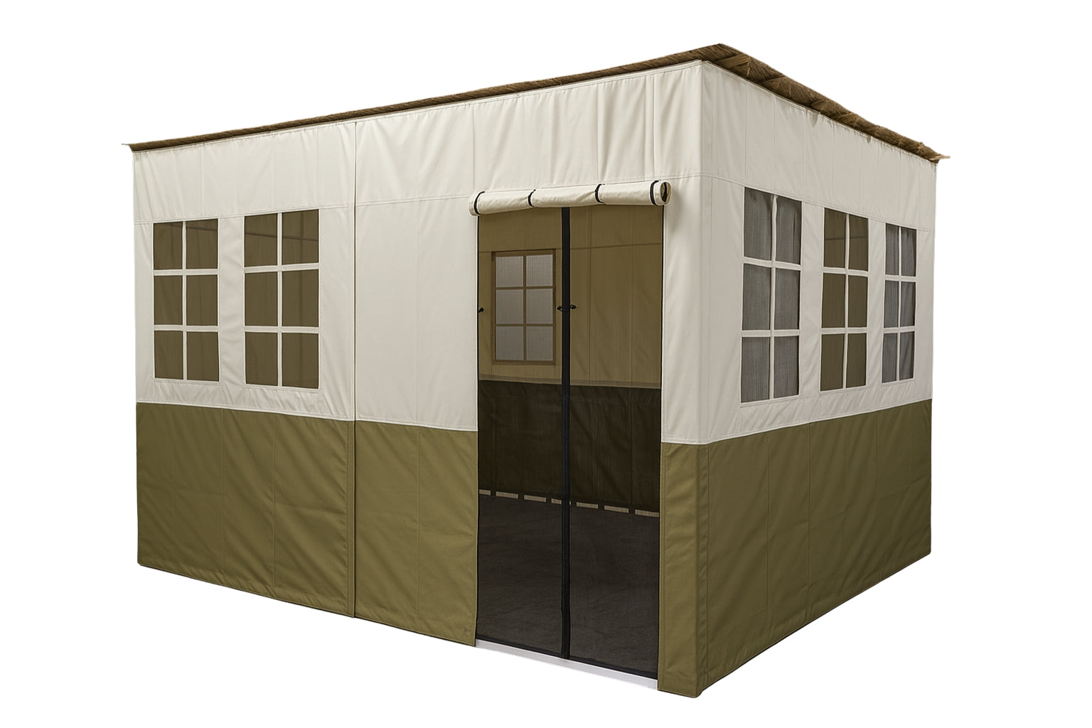 • Canvas sukkah walls with a zippered door and mesh ventilation